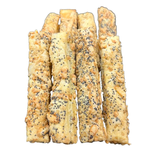 Almidón de maíz, azúcar, margarina vegetal (aceites y grasas vegetales: grasa de palma, SOJA y girasol; agua, sal, dextrosa, emulgente E-471, aromas, acidulante: ácido cítrico, conservador: E-202, colorante: carotenos) , huevo, sal, dextrosa, espesante (e-415), emulgentes (i-481 y e-472e); queso sin lactosa, semillas se sésamo y de amapola.
